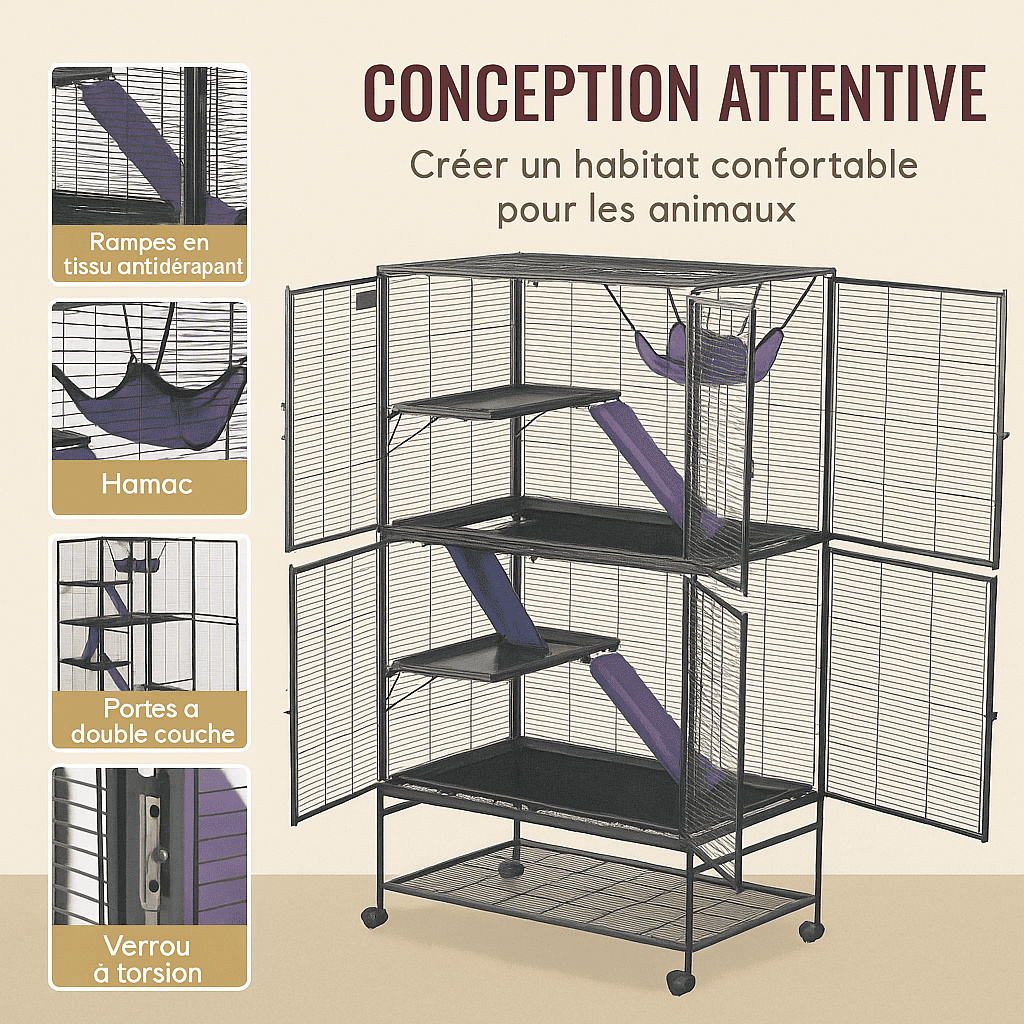 Grande cage spacieuse 4 niveaux pour rats. Rampes antidérapantes, bac litière ABS. Accueille 2-6 rats. Sécurité, nettoyage facile. Habitat spacieux et stimulant pour leur bien-être.