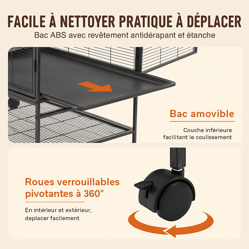 Le bac ABS amovible avec revêtement étanche et antidérapant rend le nettoyage rapide et hygiénique, un critère essentiel pour la santé de vos animaux. Déplacer la cage est un jeu d’enfant avec ses roulettes pivotantes 360° verrouillables, offrant stabilité et praticité. Cette combinaison de durabilité, de sécurité et de facilité d’entretien en fait un choix idéal pour un habitat confortable et sécurisé.